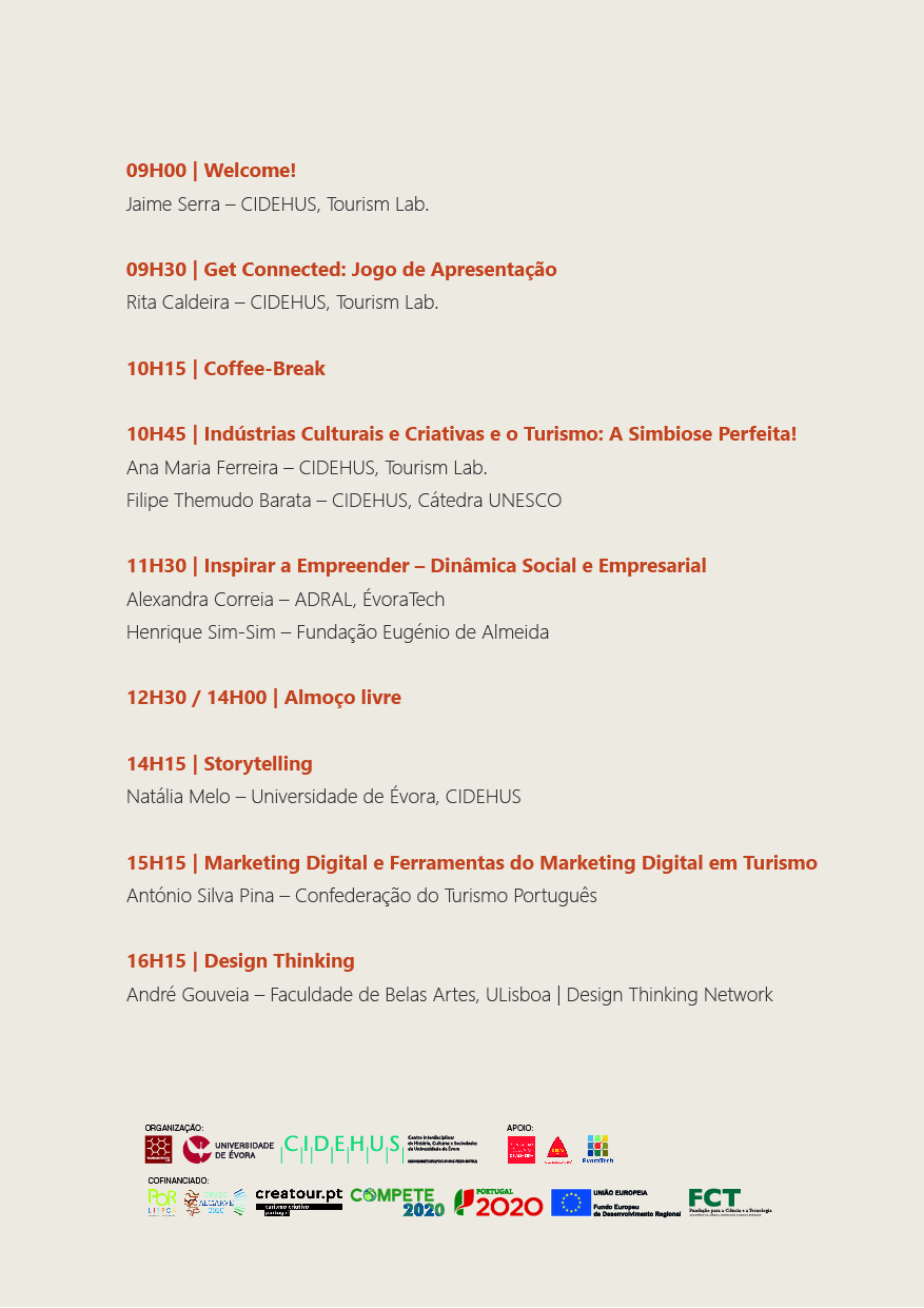 Inscrições para tourismlab@uevora.pt, até 22 de janeiro. Indicar nome, morada, contacto, entidade que representa (caso se alique) e setor de atividade;